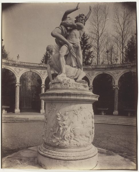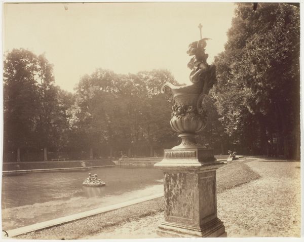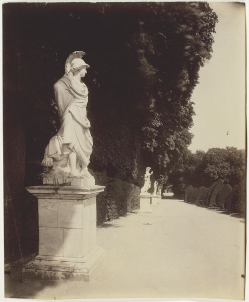 Editor: This is Eugène Atget’s “Versailles, Bassin du Midi,” a print from 1901, capturing a sculpture within the gardens. It feels so staged and serene at the same time. What do you see in this piece? Curator: Beyond the initial charm, I see a pointed commentary on power and control embedded in this landscape. Consider the choice of Versailles itself. What does this space, built to magnify the monarchy, signify to you? Editor: Well, it feels undeniably linked to wealth, aristocracy and exclusion. It was a space deliberately separated from everyday life, right? Curator: Precisely! Atget, through his lens, isn’t simply documenting the space. He’s inviting us to question the very foundations upon which such grandeur was built. Note how the light, almost uniformly diffused, softens the edges. Does this choice subvert or reinforce the rigid hierarchy? Editor: That’s interesting! The diffused light kind of equalizes everything in the frame... but isn’t the sculpture in the foreground, the focal point, still a symbol of classicism and therefore, you know, power? Curator: Absolutely. The classical figures do stand proud. But Atget might be subtly revealing the inherent contradictions within these spaces. A staged facade of freedom is revealed through what exactly? Look again. Editor: The unkempt foliage around the water's edge? Almost like nature is trying to reclaim the space... Curator: Indeed. Nature's persistence subtly undermines the manufactured perfection. The work makes me think about how art can be deployed to expose power imbalances. It's not a straightforward endorsement. Editor: I never considered that the seemingly straightforward landscape could be so charged. Curator: Atget’s photograph isn’t just about beauty; it's a layered commentary, an invitation to dissect the narratives embedded within these cultural landscapes. I learned that sometimes things can hide in plain sight if you don't ask critical questions about them.