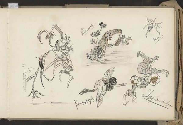 This is a sketchbook page by Johanna van de Kamer, full of Japanese motifs like rabbits, a bird, and reeds, and rendered in ink. It’s like a visual diary entry, capturing a moment in time. The ink is applied with such confidence, and the thin washes create a sense of depth. The way the reeds are drawn, with quick, vertical strokes, reminds me of traditional Japanese ink painting. See how the artist uses varying pressure to create thick and thin lines, giving the composition a sense of rhythm and movement. The dark ink gives an expressive quality, making the composition feel alive. The bird in the upper left has these sketchy outlines that give it the sense of momentary flight. It’s like the artist is trying to capture a fleeting image. The work as a whole has some resonance with the work of Kawai Gyokudō, who was making artwork in the same period. Ultimately, this piece reminds us that art is often about exploration, experimentation, and the joy of the process.