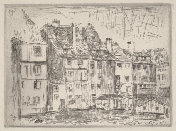 Curator: Let’s turn our attention to "Watersteintoren in Dordrecht" by Carel Frederik (II) Bendorp, created around 1872. It’s an etching, showcasing a cityscape view in the Dutch Golden Age style. What strikes you first about it? Editor: The texture! The way the lines create a palpable sense of age on those buildings, like you could run your hand across the brick and feel the dampness of the canal air. And that soft grey ink really brings a sense of quiet industry and maybe slight decay, everything’s settled but there's labour indicated. Curator: Precisely. If we delve into the social context of Dutch Golden Age cityscapes, we find more than mere architectural documentation. These etchings often reflected civic pride and served as visual assertions of economic power in a rising merchant class. There’s also the romantic aspect, a looking back at this architectural type which could point to political commentary around preserving social structures of the time. Editor: That makes me think about how the materials contribute to that reading. Etching, being an indirect process, lends itself to that sense of remove. It's not about immediate expression, but about crafting an image through layers of intervention and careful manipulation, just as those burghers created and maintained their city. Curator: Exactly. Think about who would have had access to these prints. This wasn’t art for the masses, but for those within or aspiring to the ruling elite. The details in the facades speak volumes about the importance placed on visual displays of wealth and status, perpetuating class distinction through material consumption. Editor: The choice of the Watersteintoren is key as well. This tower would be a significant, monumental, element to daily life – literally shaping not only space but labour and trade along the canals of Dordrecht. By memorializing the architecture, Bendorp has subtly framed a social power relationship rooted in location. Curator: Furthermore, we must remember the legacy of Dutch colonialism during this period and understand this apparent idyllic cityscape may mask realities of oppression and exploitation in other places and within its own boundaries. Its visual beauty should be interrogated with that history in mind. Editor: A powerful reminder of how interwoven even seemingly pastoral scenes are with broader political economies. Considering the labor and resource extraction embedded in the production of materials, even etching paper becomes implicated. Curator: This piece encourages a thoughtful meditation on our relationships with spaces. Editor: Absolutely, and also reminds us of the weight materials have within their historic moment.