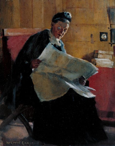 Isaac Israels made this painting, Reading Girl, with oil on canvas. Immediately, the eye is drawn to the contrast between the figure's bright red shawl and the dark, enveloping forms around her. This contrast creates a focal point that highlights the act of reading as a source of light and clarity amidst the surrounding shadows. The composition is structured by broad, confident brushstrokes that define the volumes of the figure and the setting. These strokes suggest depth without adhering to strict realism, giving the scene a sense of immediacy and life. Israels’ approach can be seen through the lens of semiotics, where color and form function as signs. The red shawl could signify passion or vibrancy, while the darker hues might represent introspection or the private world of the reader. The painting challenges fixed meanings, inviting the viewer to contemplate the relationship between the individual and their environment, and the power of reading to transform one's perception. The texture of the paint, thick and visible, emphasizes the materiality of the artwork, reminding us that it is both a representation and an object in itself, mediating our understanding of the scene.