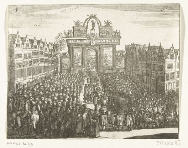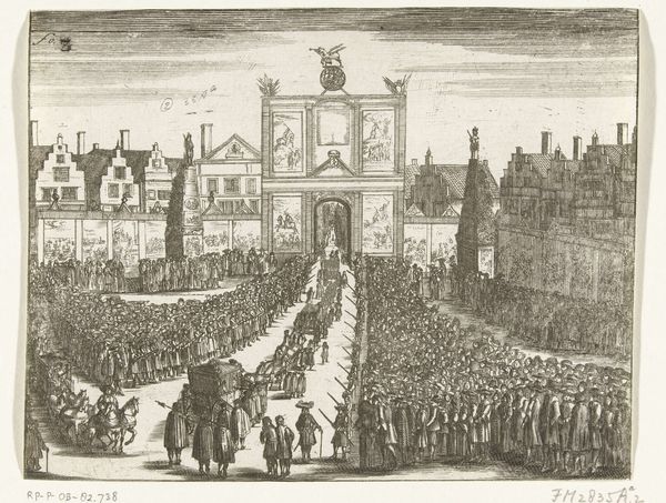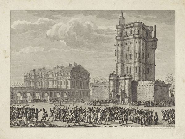 Curator: We’re looking at "Verovering van de Kattenburgerbrug, 1787," an engraving that likely commemorates an event in Amsterdam’s history. It appears to be crafted in an old engraving style. What's your initial take? Editor: A sea of people, flowing almost like a liquid tide! It has a chaotic energy, despite the relatively static style of the buildings in the background. There's something theatrical, almost cartoonish about it. Curator: Indeed. Given its time of creation in 1787, this work carries elements of Neoclassicism, which can be discerned in its precise line work and commitment to historical documentation, aligning the visual language with Enlightenment ideals of reason and order. We can think about the printmaking process and how it was very much an important communication technology back then. Editor: Knowing it’s Neoclassical helps. But honestly, my first thought was folk art; it captures a very specific moment, maybe even idealizes it, with the focus not on grand figures but on this teeming mass of people. Are they rebelling, celebrating...what are they doing? Curator: Most likely celebrating some kind of siege that liberated Amsterdam from Stadtholder troops back in 1787. This piece of graphic work then functions as political propaganda distributed for popular consumption, much like how a news press would be distributed across nations today. This cityscape offers not just historical record but also commentary on labour, the printing industry, and urban life. Editor: Thinking about the labour that went into creating this makes me appreciate the precision. To carve all these tiny, distinct figures... What do you make of that building? It dominates the left of the composition, overshadowing the drama below. Curator: Likely a warehouse. Considering Amsterdam’s maritime prominence, warehouses played essential roles, connecting trade routes and resource flow through Europe. The image therefore highlights social organisation necessary for commercial activity. Editor: The contrast between the building’s rigid, vertical structure and the swarm below creates tension. What started for me as folk art is, in the end, this fascinating intersection between art, news, labor and political ambition. Curator: Exactly, revealing how artistic creations have served purposes far beyond simple aesthetics in the broader tapestry of historical forces and production relationships.