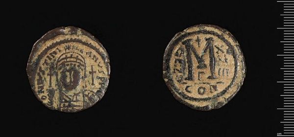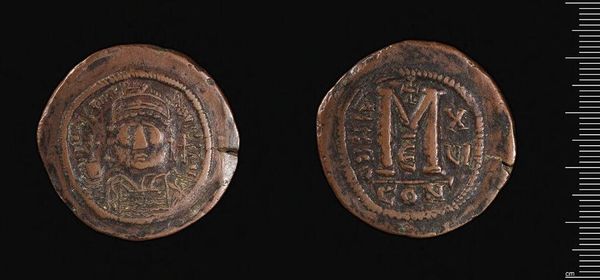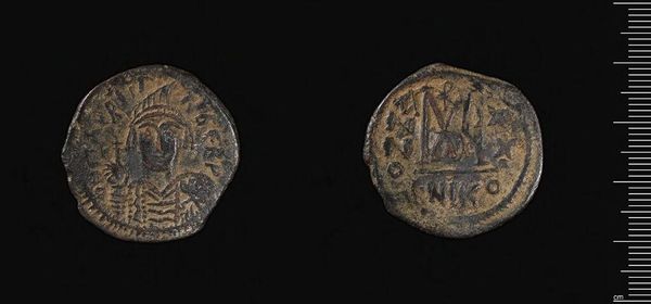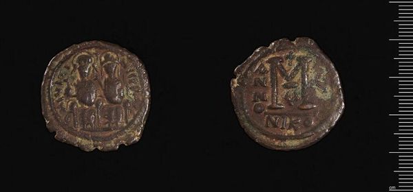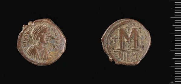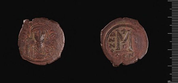 Editor: Here we have a bronze coin, "Coin of Justinian I." It seems incredibly detailed for such a small object! What can you tell me about its visual impact? Curator: Note the deliberate circular form. Observe how the incised lines create both the portrait and the inscriptions. Do you see how the patinated surface contributes to the coin's overall aesthetic? Editor: Yes, I see that now! The texture and form, despite the coin's age, provide a tangible link to the past. Curator: Precisely. The coin's materiality enhances its symbolic value. It transcends mere currency; it is a testament to Byzantine artistry. Editor: I hadn't considered the material itself as part of the meaning. Thanks for pointing that out! Curator: My pleasure. Examining the intrinsic qualities of the artwork allows for a deeper understanding of its essence.