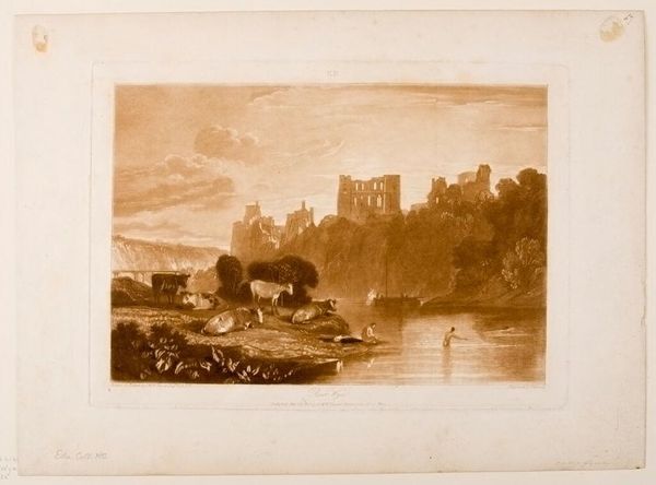 Editor: This is Paul Sandby's "Conway Castle". It's quite striking how he captures the castle, almost like a dream against the landscape. What symbols resonate with you when you look at this piece? Curator: The castle itself! Throughout history, castles have stood as potent symbols of power, security, and societal structure. How do you think Sandby portrays this cultural memory? Editor: I see both strength and vulnerability, especially with the soft lines. It feels very romantic, yet also imposing. Curator: Indeed. Perhaps Sandby suggests that even the most formidable structures are subject to time and nature’s influence, carrying the weight of history and cultural shifts. Do you agree? Editor: I do. Seeing how the castle and landscape merge, it all seems so transient. Thank you for that perspective!