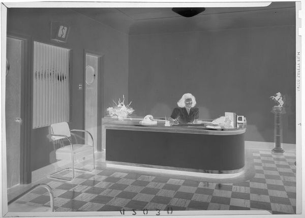Curator: This is an Untitled photograph by Lucian and Mary Brown, depicting men and women in an office setting. Editor: It has a stark, almost ghostly quality. The high contrast makes it feel like a forgotten space caught between moments. Curator: The composition highlights the repetitive nature of office work, look at the rows of desks and equipment. It really speaks to the industrialization of labor in the mid-20th century. Editor: Yes, and the racial segregation suggested by the image's context is also hard to ignore. Who has access to certain roles and spaces? This photograph then becomes a powerful document of power dynamics. Curator: I agree. The materiality of the photograph itself becomes significant; the chemicals, the printing process, all part of a larger system of production and representation. Editor: Absolutely, it’s a visual reminder that even seemingly neutral documentation carries its own biases and historical weight. Curator: It really makes you think about the unseen labor behind the image as a cultural artifact. Editor: Indeed, and how historical images shape our understanding of labor and identity today.
