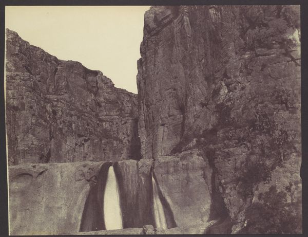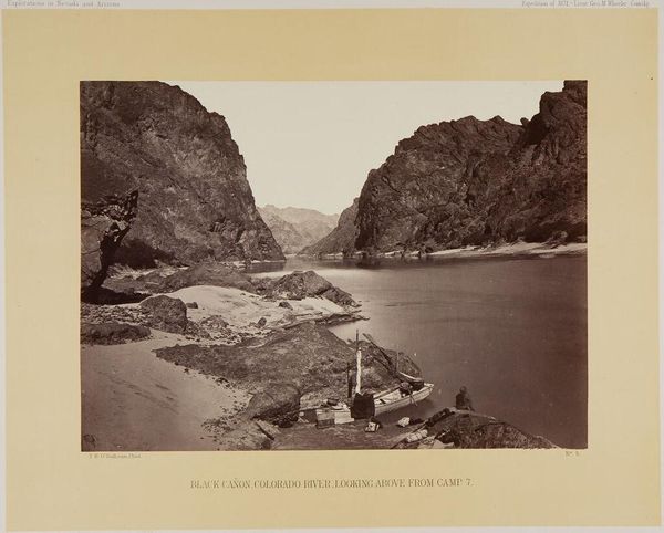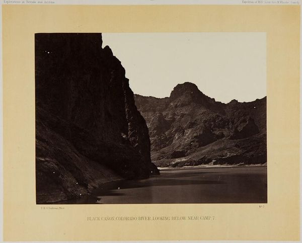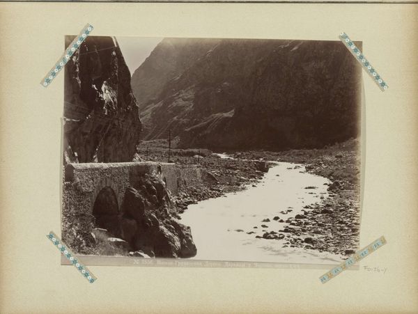 Editor: This albumen silver print, taken by Charles Roscoe Savage around 1880-1900, is titled *Curecanti Creek in Black Canyon, Gunnison National Park, Colorado*. It's quite a stark image; the landscape feels imposing, almost industrial. What's your interpretation? Curator: This photograph reveals the complex interplay between the natural world and industrial expansion in the late 19th century. We see nature, seemingly untouched, yet the railroad's presence signals a forceful encroachment. The image, circulated and displayed, actively promoted westward expansion and resource extraction under the guise of scenic appreciation. It begs the question: whose perspective are we adopting when we view this landscape? Editor: So, it’s not just about a pretty picture. It's promoting a specific narrative about progress. Do you think that changes how people viewed these landscapes at the time? Curator: Absolutely. Consider the institutional context. Savage likely made these images for the railroad companies. The photographs served as promotional material, encouraging settlement and investment by romanticizing the land, while simultaneously downplaying the impact on Indigenous populations and ecosystems. The photograph performs a crucial function: it visually justifies the railroad's intrusion into the landscape. Editor: That makes me think about how photography can be used to shape public perception and serve economic interests. It feels much less like a neutral observation now. Curator: Precisely. This piece underscores how artistic creation is intrinsically linked to political and social agendas. It demonstrates that museums, galleries, and the art market itself are not neutral spaces but rather play a crucial role in shaping and disseminating particular ideologies through images like this. What’s your takeaway from this? Editor: I’m rethinking my initial reaction! It's not just a landscape, it's a loaded document. I will think more critically about the context next time. Thanks!