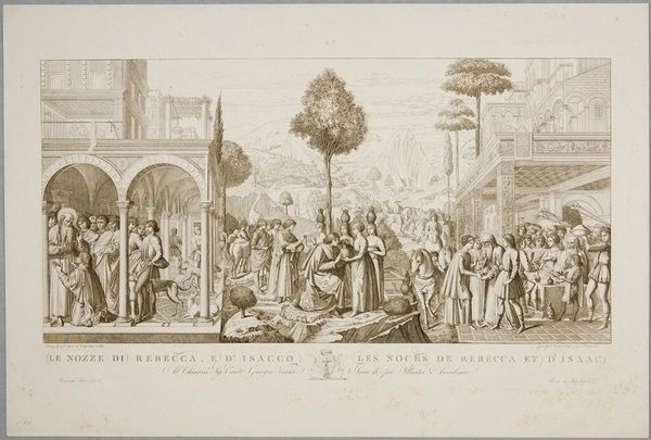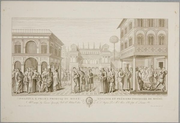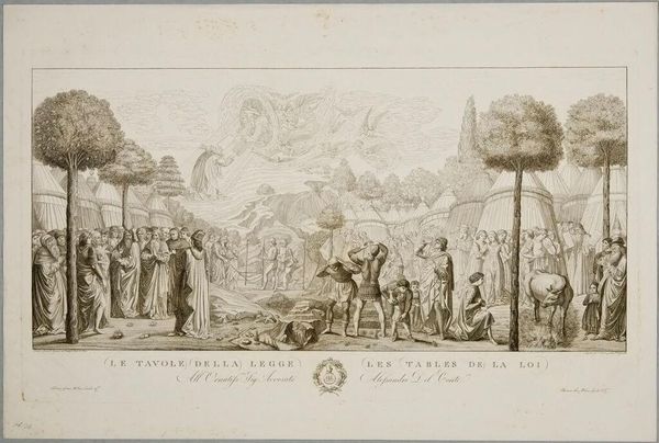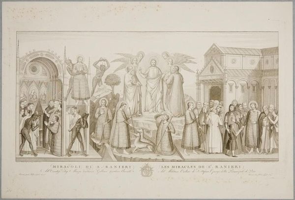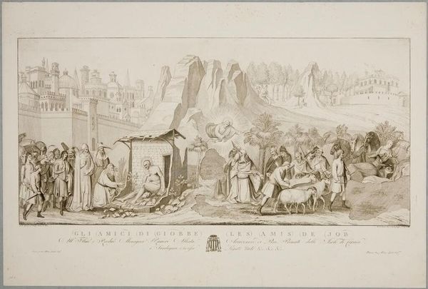 Curator: This is Conte Carlo Lasinio's "The Burning of Sodom," held here at the Harvard Art Museums. Editor: What strikes me first is the sheer density of the scene – so many figures crammed together. It gives an impression of utter chaos and panic. Curator: Indeed. Consider the narrative: this scene depicts divine retribution. See how the figures writhe and collapse under the fire raining from the heavens? They're symbols of humanity's descent into sin, judged and punished. Editor: And note how this judgment is rendered through the etching process itself, the act of incising the plate suggesting destruction. The contrast between the delicate lines and the violent subject matter really emphasizes the precarious nature of civilization. Curator: It's a potent reminder that moral failings will inevitably lead to societal collapse. Editor: Right, and that the very tools and techniques we use to create and represent can also be instruments of critique. A fascinating use of materials to convey a complex message. Curator: Truly. A convergence of symbolic weight and material articulation. Editor: Leaving us to ponder the relationship between creation and destruction.