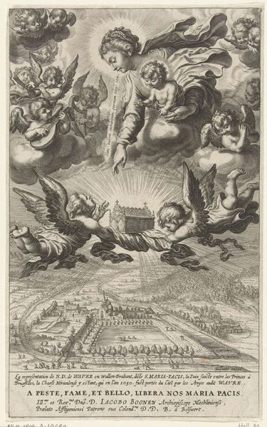 Curator: The "Annunciation to the Shepherds by Angelic Choirs," an engraving completed in 1587 by Johann Sadeler I, now resides in the Rijksmuseum. Look at how this intricate print unfolds a story of the divine meeting the pastoral. What is your first reaction to the composition? Editor: Overwhelmed, yet strangely comforted. The scale feels vast, with heaven breaking open, but the line work and dense layering also feel meticulously controlled and intimate, like a miniature drama playing out on a grand stage. It seems like organized chaos. Curator: The composition employs a strong vertical axis. From the heavenly host at the top to the startled shepherds below, a clear hierarchy is established. Note the symbolic use of light emanating from above, illuminating the scene and drawing our eye through the narrative. How might we interpret that shaft of light, or that sense of illumination? Editor: Well, beyond the obvious religious connotations, that visual hierarchy interests me, particularly the shepherd’s reaction below: fearful and perhaps uncomprehending of this announcement. Is this division purely celebratory or a more critical commentary on social strata, the divide between the divine message and the lives of those who receive it? Are they really equipped to even comprehend what they're witnessing? Curator: Indeed, Sadeler's Northern Renaissance style integrates both detailed observation and symbolic representation. The angelic figures are rendered with classical grace, while the landscape shows attention to naturalistic detail typical of the era. We also should note the placards the angels bear: sheets of music. The announcement of peace delivered in glorious harmony. Editor: Those musical notations underscore the sense of order and divine harmony, contrasting rather sharply with the rustic, earthly chaos below. And I think that in terms of interpretation it’s difficult to not consider the implications of such strong hierarchies given the rising power of mercantile class in the North at this point, the religious wars – who got to receive heavenly grace? I am not sure the artwork gives any conclusive answers to these kinds of issues but that's okay too, right? Curator: Ultimately, Sadeler leaves us to contemplate the mysteries of faith, the power of divine intervention in the mundane, and the intricate tapestry of artistic expression. The details reveal much upon closer inspection. Editor: It's more than just a pretty picture; it's an invitation to engage with questions about belief, social structure, and artistic intention, which hopefully sparks necessary conversations, as well.