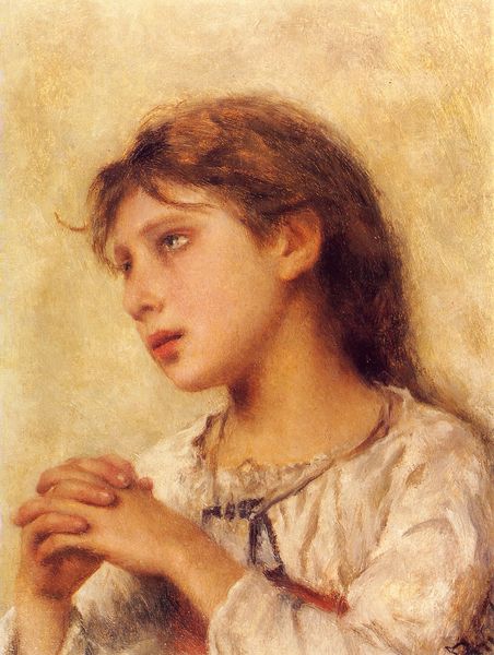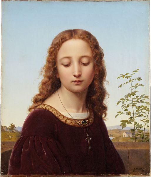Curator: Oh, she's lovely. There's a gentle melancholy to her gaze. Editor: Indeed. This is George Frederic Watts’ portrait of Virginia Dalrymple. The artwork serves as a striking example of Victorian portraiture, capturing not just likeness but also an air of pensive introspection. Curator: Introspection definitely resonates. I feel she's on the cusp of something profound, a decision or a realization hanging in the air. The holly behind her head feels like a crown of thorns, or maybe just foreshadowing. Editor: The holly could symbolize foresight and protection, acting as a subtle commentary on the role of women in that era – both protected and constrained by societal expectations. Her gaze avoids direct confrontation, reflecting a sense of internalized conflict. Curator: It’s quite moving, to see her portrayed with such tenderness and depth. Watts seemed to capture something essential in her spirit. Editor: Absolutely. Watts provides us a glimpse into the inner life of a Victorian woman, her spirit both delicate and resilient, framed by nature and societal constraints. Curator: It makes you wonder about her story, doesn't it? A story that lives on, whispered through paint and canvas. Editor: It certainly does. We can only imagine.