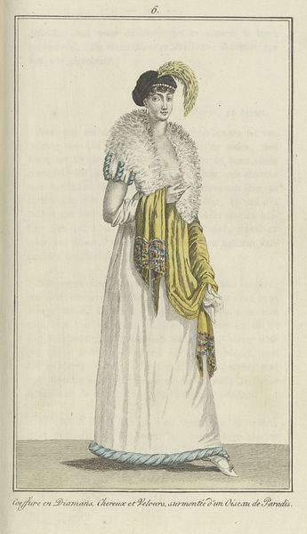 This print by Horace Vernet, from 1805, showcases Parisian fashion, focusing on the 'Peigne et Aigrette en Diamans' – the comb and diamond plume. Consider the plume: it's an ancient symbol of power, resurrection, and immortality, seen in ancient Egyptian headdresses, associated with divinity. Here, in early 19th-century Paris, it adorns a fashionable woman, signaling status and elegance. It reminds me of Botticelli’s Venus, her flowing hair echoing the dynamism of the plume. The diamond aigrette, a cluster of gems, transforms the wearer, invoking a sense of ethereal beauty, while the fan adds to the play of concealment and revelation. This is not merely fashion, but a conscious performance, deeply rooted in our collective memories. The plume, then, is an enduring symbol – a constant presence on the stage of human expression.