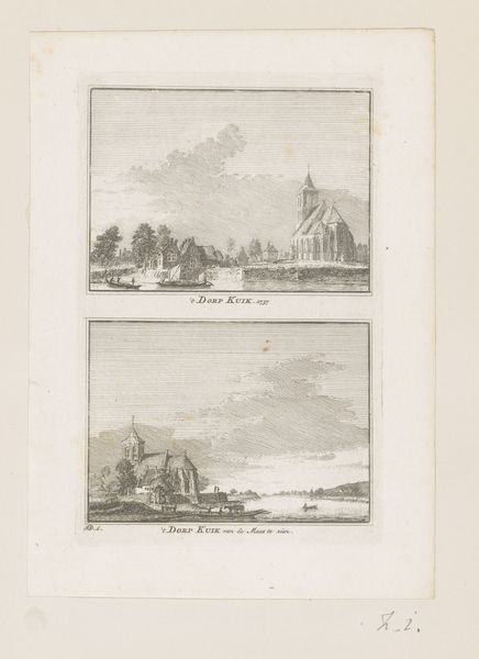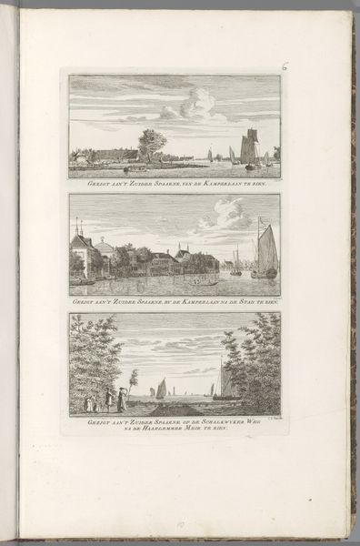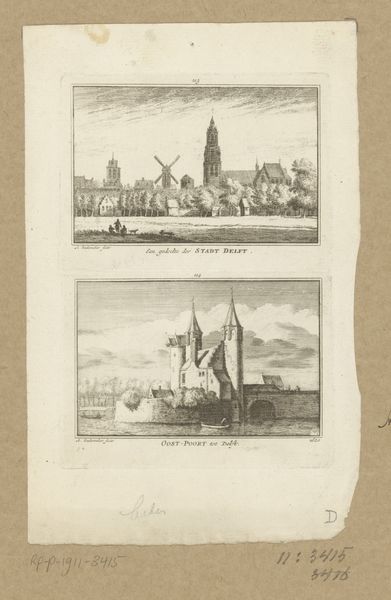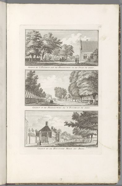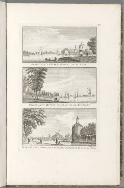 Curator: So here we have a page from Hendrik Spilman's sketchbook, "Gezichten op de stadswallen en poorten van Haarlem," dating from 1761 to 1763. Three pen-and-ink sketches on toned paper, each capturing a different view of the city. What catches your eye? Editor: An uncanny nostalgia. The windmills especially evoke a sense of time slipping, like these images are echoes from someone's pleasant, daydreamy afternoon. What are these windmills emblems of, I wonder? Curator: Windmills often symbolize progress, industry, and ingenuity – harnessing nature's power. They are potent signifiers of Dutch identity, linked to land reclamation and prosperity, even resilience. Their enduring presence, even now, signifies a connection to this past. But Spilman's images... They’re interesting because he combines these symbols of Dutch strength with quite ordinary, unassuming scenes. Editor: It’s a comforting paradox, this marriage of monumental identity with simple daily life. It tells a story about pride, surely, and practicality, too. He depicts them alongside folks on bridges and by buildings. Do you suppose there are subliminal allegories being suggested? I'm wondering about trade, maybe, given Haarlem's history. Curator: Perhaps, but I think it is possible he was simply capturing the environment around him, observing how the daily commerce intersects with these historical landmarks. It isn’t only trade or one specific activity; these structures were vital to every facet of early Haarlem life, to everyone who moved within its borders. I don’t think Spilman needs allegory when these buildings speak so eloquently on their own. Editor: So you're drawn to their architectural, almost topographical, presence. While I lean toward interpreting the windmills as symbols interwoven with daily activities, their very existence creates a shared identity that extends through time. But even if we disagree on this point, Spilman’s sketches have transported me to this distant place. Curator: Indeed, they’re an invitation to consider the narratives woven into landscapes.
