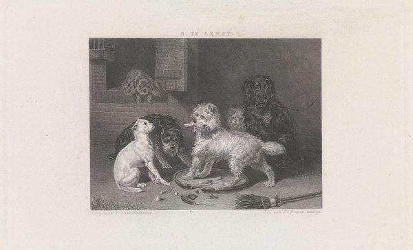 Christiaan Lodewijk van Kesteren created this print of a black and white dog, titles "Zwarte en witte hond", sometime in the 19th century. During this time, class was expressed through highly visible signs, and the ownership of specific dog breeds was no exception. Consider this image as more than a simple representation of pets. It subtly hints at the prevailing social hierarchies of the time. The contrast of a black dog and a white dog fighting over a bone, becomes a narrative of competition and perhaps even a reflection on racial and class dynamics. How might the dogs' breeds and their perceived values play into this interpretation? The image offers a glimpse into the negotiation of power, where even the most domestic scenes could echo larger societal tensions. It invites us to consider the ways in which we project our own biases and understandings onto the world around us.