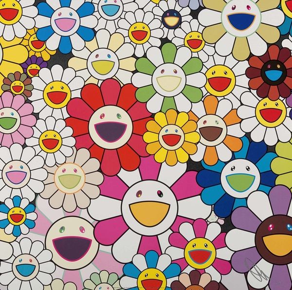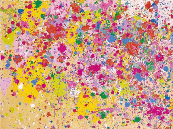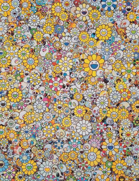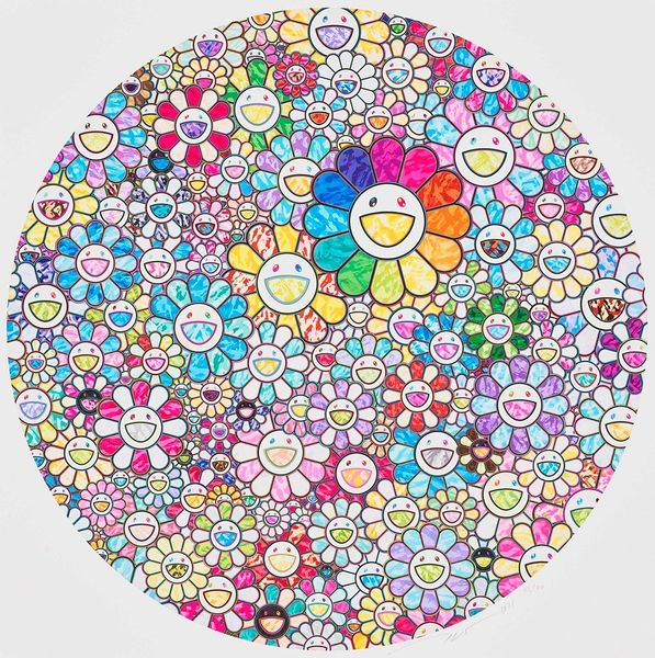 Editor: Here we have Takashi Murakami's "An Homage to Monogold D" from 2012, made with acrylic paint. The overwhelming field of smiling flowers, even though they're colourful, feels somehow… anxious to me. What's your interpretation of it? Curator: The "anxious" feeling you describe is interesting. Murakami's work operates within a complex socio-political landscape. He critiques the flattening of culture in postwar Japan and the global rise of consumerism. How might this endless repetition of smiling flowers, this explosion of "cuteness," be read as a symptom of that cultural flattening? Editor: I guess I hadn't thought about the "cute" aesthetic being critical, I assumed it was more decorative. Curator: Decoration certainly plays a role, but consider the context. After WWII, Japan saw an influx of American culture. Murakami positions himself within this history, appropriating and subverting elements of both traditional Japanese art and Western Pop Art. What do you notice about the scale? Editor: It’s quite large, creating an immersive experience. You are surrounded by the flowers, like being caught in a crowd. Curator: Exactly! It overwhelms. He aims to create a "Superflat" aesthetic, where traditional depth and perspective are flattened. Think of it in contrast to traditional landscapes that offered contemplation. Murakami’s "Superflat" doesn't offer escape, it confronts. Editor: So, the cuteness is perhaps a mask? A way to talk about serious issues without being overtly critical? Curator: Precisely. By embracing this commercially viable aesthetic, he critiques the very system that produces it, engaging a wide audience and prompting reflection on our consumer culture. Editor: That's fascinating. I'll never look at those smiling faces the same way. I'm going to have to read more on this! Curator: I feel as though I've been introduced to new concepts; now I see Murakami in a different, meaningful way. Thank you!