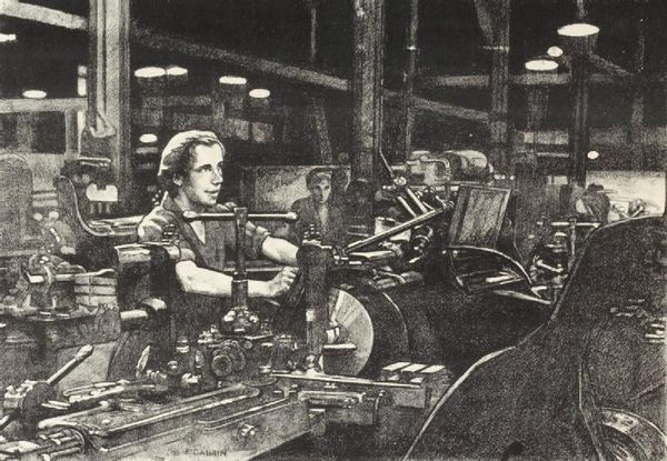 Editor: This is "Ruby Loftus screwing a Breech-ring" by Laura Knight, painted in 1943. It depicts a woman operating machinery in a factory. There’s such a focus on the mechanics and the activity. What strikes you about this piece? Curator: The sheer materiality is compelling. Knight meticulously details the metal of the machines, the fabric of the overalls, and even the texture of Ruby's skin. This elevates the labour itself to the level of artistic consideration. How does the depiction of this machinery impact your viewing experience? Editor: It's fascinating to see these industrial tools given so much prominence, almost like character portraits themselves. It definitely changes my understanding of labor's role in art. Curator: Exactly. Knight uses oil paint to capture the processes and physical nature of wartime production. Notice the repetitive nature of labour visualized in the rows of women, emphasizing both individual skill and collective effort in war industries. The focus shifts from grand narratives to the lived experiences within the means of production. Do you see how she's challenging high art’s traditional focus? Editor: Yes, it really does reframe what's considered a worthy subject for art. It makes me think about all the unseen labor behind objects we consume daily. Curator: Precisely. Knight compels us to think about the often invisible human processes embedded within manufacturing and consumption, ultimately blurring lines between art, craft and labour. Editor: This has opened my eyes to the relationship between materials, labour, and art in a way I hadn’t considered before. It’s more than just a portrait, it's a statement. Curator: Indeed, the focus on materiality gives voice and recognition to overlooked aspects of wartime effort, thereby influencing our own understanding of labor practices then, and today.