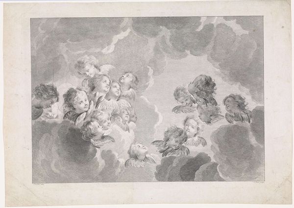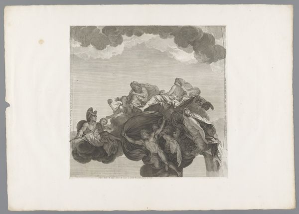 Curator: Ah, this engraving, "Ceres, Cybele en de volgelingen van Flora op de wolken," was crafted by Bernard Picart between 1713 and 1719. I find the allegorical themes and figures intriguing. Editor: It’s ethereal. Almost dreamlike, the way the figures seem to float amongst the clouds. There's a lightness that belies, I imagine, some heavier symbolism. Curator: Precisely. Consider Ceres, the goddess of agriculture, alongside Cybele, the Anatolian mother goddess associated with fertility, nature, and wild animals. Then there are Flora’s followers, weaving their revelry among the clouds. The baroque style lends itself perfectly to the drama and grandeur of such a celestial gathering. Editor: And where does that snake, right above Ceres, fit into all of this? It definitely shifts the image's dynamics, even complicates it slightly. I mean, snakes carry so much cultural baggage, don't they? Deception, transformation, but also healing and medicine... It gives a very Edenic tone. Curator: An astute observation! The serpent is indeed a potent symbol with layers of interpretation. In classical imagery, it can represent wisdom, immortality, but also chaos and the chthonic forces of nature. Its proximity to Ceres, a symbol of abundance and order, creates a tension that reflects the constant negotiation between the wild and cultivated, nature and civilization. It definitely disrupts the expected harmony, which is actually what I appreciate most about it. Editor: Disrupting expected harmony… I can definitely see how Picart uses that dissonance to highlight the social order of the time. Consider how those “chthonic forces” and associations with deception would likely have been mapped onto marginalized groups – women, perhaps, or those accused of witchcraft. By weaving this into the scene, he subtly engages with the politics of representation and societal control. Or, maybe not? Is there evidence that would counter this reading of your disruption of harmony? Curator: That's certainly a viable lens through which to view it. I see how you draw that link to social power structures. Perhaps the engraving subtly reveals the anxieties inherent in attempts to control nature and fertility – anxieties projected onto those who were perceived as untamed or dangerous. I hadn’t considered that before. Editor: These historical imprints really bring such a depth and complexity to our reading. Curator: Indeed. It’s fascinating to see how even in something seemingly straightforward, cultural history keeps informing art production and visual grammar. Editor: Yes, and how relevant such old imprints still feel when seen from today's society.