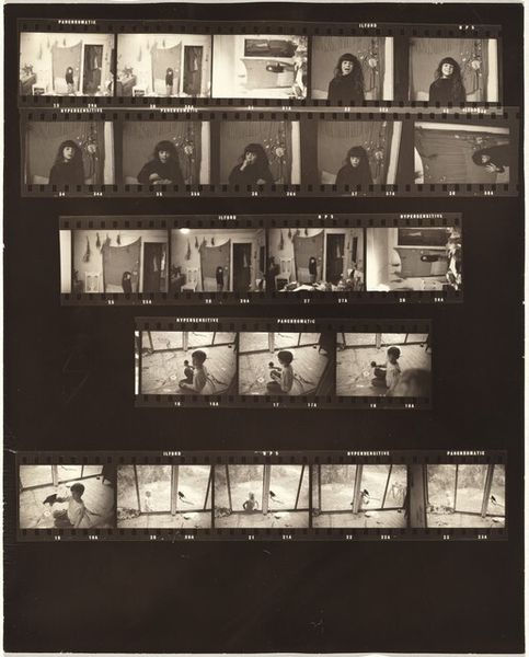This photographic work by Robert Frank presents us with a strip of celluloid film, a material synonymous with the 20th century and its culture of mass media. Frank, a master of street photography, used his camera as a tool to capture spontaneous moments, freezing slices of life as they unfolded. This film strip shows the raw, unedited results of that process, the contact sheet offering a glimpse into the artist's working method. The texture is grainy, the contrast stark, reflecting the gritty reality Frank sought to portray, a deliberate choice that went against the polished aesthetics of commercial photography. The darkroom work is evident in the developing process. This materiality is tied to the social context of the time; the labor involved, the use of technology, and the consumption of images. Frank's work challenged the boundaries of traditional art, elevating the everyday into the realm of artistic expression. Ultimately, this film strip invites us to consider the making of an image and its connection to the wider world.