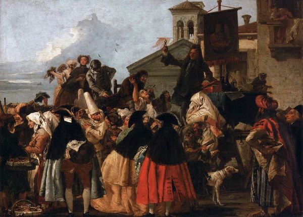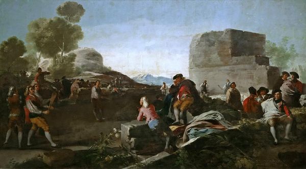 Editor: This is "The Blind Guitar Player" by Francisco de Goya, painted in 1778, using oil. The scene unfolds with such bustling activity around this central figure. I'm immediately drawn to the contrast between the somber musician and the lively crowd. What initially captures your attention when you look at this piece? Curator: Ah, Goya! Always a little world unto himself. What I see is a tapestry woven with the threads of light and shadow. This work transports me to a sun-drenched day, filtered through the leaves of that exquisite tree, almost baroque in its gnarled exuberance, casting a stage upon which this humble performance unfolds. Note how Goya contrasts the darks and lights, not just to give us depth, but emotion, too. Can you feel it? The earthy tones... almost a yearning there, don't you think? Editor: Yes, there’s definitely a contrast, but it feels almost like he’s poking fun. Like, isn’t this a bit romanticized for poverty? Or am I missing the point? Curator: Missing? Never! Maybe enhancing is a better word. Goya, he wasn't just documenting; he was always making a statement. Yes, it could be read as romantizing a rather grim situation, and yet I feel it serves more as a tribute, a celebration, even, of humanity's persistent song, especially when life gives us a minor chord. A painter after my own heart, finding light in unexpected places. Editor: That's beautifully put. I hadn't thought about it in terms of a celebration. Seeing the artist's emotion in the light really shifts how I understand the piece. Curator: Indeed. Art’s always offering up new perspectives if we are willing to see differently. The light isn't just light; it's a chance. Editor: So true. It is good to look again, and again, at how artists communicate a world that might have been or one that actually was. Thanks for this closer look.