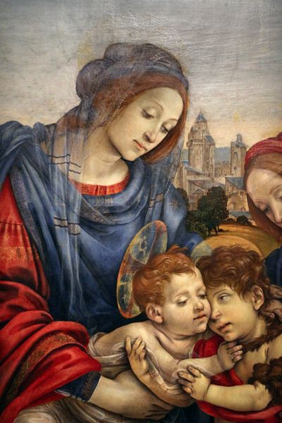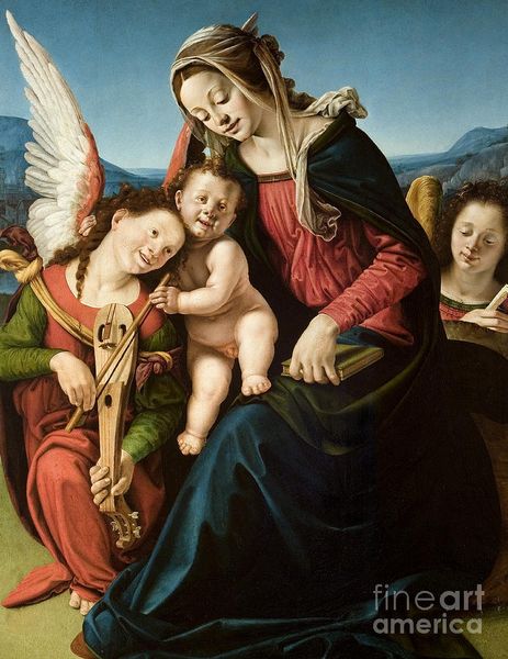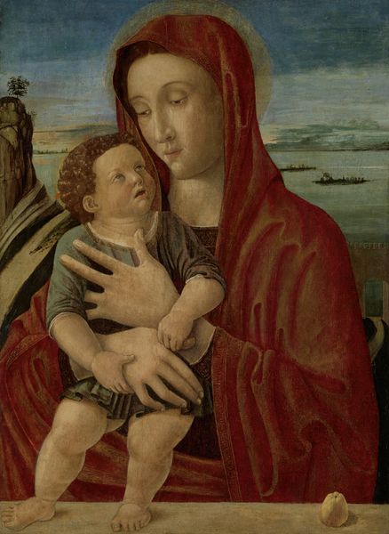 Editor: This oil on canvas piece is "Madonna and Child" by Gaudenzio Ferrari, dating back to the High Renaissance, sometime between 1525 and 1535. The mood is quite tender, even a little theatrical, wouldn't you say? What’s your read on it? Curator: Tender, theatrical, yes, and profoundly human. I see a yearning gaze in the Madonna's eyes that transcends the idealized beauty of the Renaissance. It feels incredibly personal, like a glimpse into a very private, motherly moment amidst a rather staged scene with those playful cherubs. Are they stagehands, I wonder, peeking out from behind a curtain? Or perhaps harbingers of both joy and sorrow? It really makes one think about the duality of motherhood, doesn't it? Editor: That’s interesting. I was mostly focusing on the colours – that gorgeous green against the red curtain. Did colour have some symbolic meaning back then? Curator: Colour was crucial, almost another language! Here, the deep greens might allude to hope, renewal, and perhaps a hidden connection to nature – though, let’s be honest, that shrubbery looks a little artificial to me, almost as if it's been rented for the occasion. But the red...Ah, that's where things get complicated. It's passion, sacrifice, maybe even a foreshadowing of future suffering. Does the interplay feel intentional to you? Editor: Absolutely! It's like Ferrari is layering meanings, making it more than just a pretty picture. Curator: Precisely. Art isn't always what's in front of us. Editor: Definitely given me a lot to think about when looking at Renaissance paintings in the future! Curator: Wonderful! Maybe you will see things the way I do some day. It just might change how you see the whole world.
