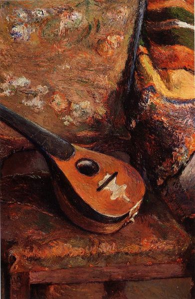 Curator: Kuzma Petrov-Vodkin’s 1918 oil painting, simply titled "Violin", presents a rather unique juxtaposition. Editor: Oh, my, what a melancholic silence radiates from this painting. It feels almost elegiac, the muted browns of the violin contrasting against what seems to be a muted cityscape beyond the window. What do you make of it? Curator: It's compelling, isn't it? Considering it was painted during a turbulent period in Russian history, the scene resonates beyond its still life aesthetic. Petrov-Vodkin was part of the Russian avant-garde movement. His artistic approach often involved manipulating perspective. Editor: Absolutely. I sense his famous "spherical perspective" at play. That tilted, slightly unsettling view—as if the world itself is off-kilter, much like trying to grasp at straws when hope wanes thin as gossamer. I think he suggests an interesting relationship with music—like art offering harmony in dissonance, finding something beautiful, maybe necessary, to hold. Curator: That’s insightful. This perspective creates a certain tension and invites us to view the commonplace from new, slightly destabilized angles. And it makes me think how Russian art grappled to make art politically effective after the revolution in ways that was not only propaganda, but emotionally rich with subjective perception. Editor: The painting technique amplifies those subtleties. Oil lends it such weight and dimension – which really serves the muted color and geometric qualities. I imagine it as Petrov-Vodkin processing war's discord – rendering order, meaning. It's a quest through canvas and composition. Curator: I'm reminded of the larger art world too—it demonstrates this ongoing interplay, art mediating social upheaval, a visual testimony. "Violin" embodies a larger narrative: our innate ability to express harmony. Editor: Exactly, and within this harmony lies an aching truth; perhaps, Petrov-Vodkin shows how much beauty needs tension. It's a potent truth, still resonant.
