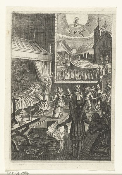 Editor: Here we have Bernard Picart's "Europa in een bibliotheek," created in 1718. It's an engraving and is currently held at the Rijksmuseum. The composition feels very dense and symbolic, almost like a visual puzzle. What do you see in this piece, beyond the surface-level imagery? Curator: It's a fascinating allegorical print. Note how Europe is depicted not just as a queen, but enthroned within a library—a space traditionally associated with male scholarship. Consider the implications of situating a female figure, embodying a continent, within this context. What tensions might arise from that placement? Editor: That's a great point. I hadn't really considered the gendered aspect of the library setting. Are those cherubs around her significant too? Curator: Absolutely. They represent arts and sciences, yet their playful depictions create a sense of both promotion and perhaps trivialization of female rule and intellectual capability. Also, think about the presence of Islamic art imagery worked into the whole picture and the context of Dutch-Golden-Age exoticism: does this work reflect or challenge dominant European perspectives? How might colonialism inform this representation? Editor: So, it's more than just a depiction of Europe; it's a commentary on power, knowledge, and perhaps even the complicated relationship between Europe and other cultures. Curator: Precisely. The engraving invites us to consider the societal power dynamics reflected in the choices made when allegorizing something. By examining these components and posing difficult questions, we're equipped to delve deeper into art as historical, philosophical and societal mirror. Editor: I’ll definitely be approaching similar works with a more critical eye from now on. Thanks for that insightful context!