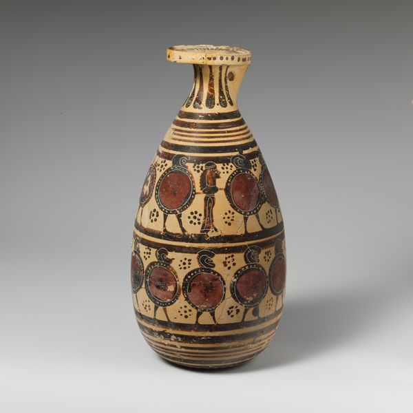This is a fragment of a terracotta jug, or oinochoe, made by an anonymous artist. Although just a portion remains, we can still appreciate the craftsmanship involved. The jug was likely formed on a potter's wheel, a technology that allowed for efficient production of standardized forms, thus meeting the demands of a growing population. Notice the painted decoration – mythological creatures and geometric patterns meticulously applied, reflecting the artistic conventions of the time. The jug's material – humble terracotta – speaks volumes about its intended use as an everyday object, rather than a luxury item. It is a testament to the essential role of craft in ancient societies, and its ability to bring both beauty and functionality to even the most mundane aspects of life. Consider the skilled labor required to produce this vessel, and the social context in which it was made.