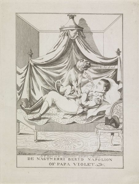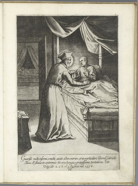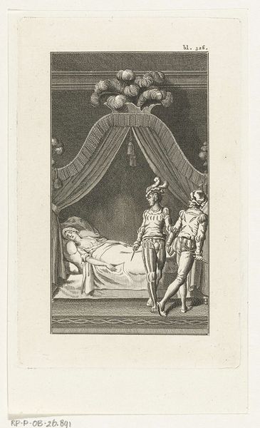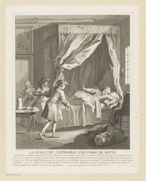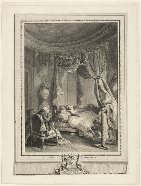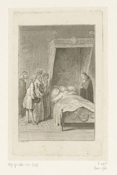 Daniel Nikolaus Chodowiecki created this etching titled 'Heer Wolmar aan het bed van Julie' at an unknown date. This piece provides insight into the sentimental culture of the late 18th century. The scene captures a poignant moment, likely inspired by contemporary literature, where Wolmar sits bedside, holding the hand of the ailing Julie. It encapsulates the era’s fascination with emotion, morality, and the human condition. Made in a time when printmaking was flourishing in Europe, this intimate scene would have been widely accessible, allowing for broader engagement with its themes. Engravings like these served as visual aids for a burgeoning reading public, illustrating popular novels and plays. They reflect the social norms and values of the time, offering glimpses into domestic life, fashion, and the prevailing attitudes towards love, loss, and virtue. To delve deeper, one might explore the literary sources that inspired Chodowiecki, examining the artist's other works to understand the cultural milieu that shaped his vision.
