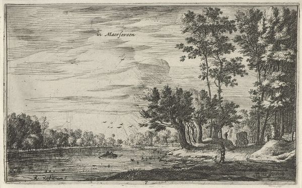 Curator: This etching, titled "Kerk van Arkel," by Roelant Roghman, likely made between 1637 and 1677, offers us a serene slice of 17th-century Dutch countryside, now residing here at the Rijksmuseum. Editor: The word that springs to mind is 'contemplative.' It’s mostly the monochrome palette, isn't it? Gives it a muted, almost wistful quality. I am really getting a lovely, reflective mood. Curator: Indeed. Roghman masterfully employs line etching here, creating a textured landscape that guides the eye. Note the arrangement of forms; how the cluster of trees commands our immediate attention, anchoring the composition. Editor: Oh, and look at the church steeple in the distance; that little tiny spike feels monumental, doesn’t it? Makes me think about the power of simplicity, how just a little thing can alter your whole sense of perspective. Curator: Precisely. That subtle suggestion of monumentality within the everyday landscape touches upon core aesthetic tenets of the Dutch Golden Age. Semiotically, it hints at stability amidst societal shifts. Editor: Societal shifts, wow. I was just musing about the folks who once trod that little winding path, and what sort of day they might have had on their minds, maybe what they did later in the day. Much simpler ideas for me I am afraid. Curator: It is also essential to acknowledge the composition's linear precision—each line, each curve meticulously contributing to a delicate yet structured panorama. Consider the artist’s use of the negative space to delineate forms and to communicate space. Editor: All right, so on the level of structure, it is really cleverly assembled—there is a hidden order keeping the picture balanced and making visual sense to my brain. I think I’ll always come away feeling charmed by the light and detail he puts into the natural forms, though. Curator: In essence, "Kerk van Arkel" captures the interplay between artistic intent and the surrounding world. Editor: To me, it's that whisper of human presence within the overwhelming nature which leaves me wandering and wondering after just a glance.