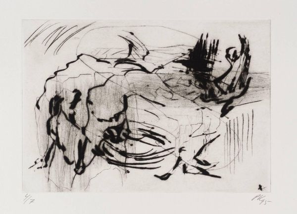 Editor: This is "Spinning Man II" by Dame Elisabeth Frink, part of the Tate Collection. It's a black and white image, and the swirling lines give it a feeling of disorientation. What do you see in this piece? Curator: The 'Spinning Man' becomes a potent symbol, doesn't it? Frink's work, particularly in the latter half of her career, often grappled with themes of anxiety and vulnerability. How does the swirling, almost chaotic composition contribute to this sense of unease? Editor: It definitely makes me feel like I'm losing my balance. Curator: Consider that Frink created this during a period of considerable social and political upheaval. The motif can be interpreted as a reflection of the individual struggling within a world that feels increasingly unstable. Editor: So, it's more than just a literal spinning figure? Curator: Indeed. It's about psychological turmoil made visible. Visual symbols carry the emotional weight of cultural memory. Editor: That's a really insightful way to look at it. Curator: Precisely. And art offers us that possibility, to reflect on the continuity of our shared experience.