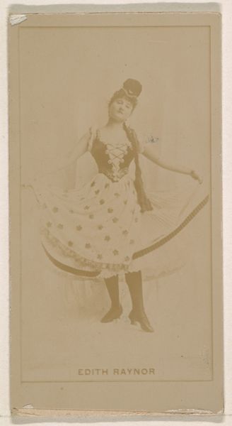 Curator: There’s a delicate air surrounding this small print. It’s titled "Italian Dancer, from the Dancing Women series," dating back to 1889, produced by Wm. S. Kimball & Co. It’s currently housed here at The Met. Editor: Yes, the composition is so graceful! It almost feels like a fleeting glimpse. But something about her stance seems... a little too poised, perhaps? Curator: Interesting observation! You have to consider that this was not created as “high art.” These prints were actually distributed as premiums with Kimball & Co. cigarettes. Think of them as precursors to trading cards, aimed to entice a largely male consumer base. Editor: So the "Italian Dancer" then becomes a symbol…of exoticism and entertainment commodified and distributed as a promotional item. What's striking to me is how this particular imagery feeds into a certain European fascination with, or perhaps objectification of, Italian culture. Curator: Precisely. The dancer is rendered in watercolor, imbuing a soft, romantic aura, but this idealization obscures the complex reality of the Italian diaspora. The rose in her hair, the colors of the ribbons, the suggestion of passion - they create an idea of Italy, not necessarily the actuality. Editor: And this manufactured imagery perpetuates specific narratives. I wonder how such widespread distribution impacted societal views on Italian identity at the time? The cigarette cards functioned almost like miniature propaganda. Curator: That’s certainly something to consider. And the “Dancing Women” series overall tells us a lot about the objectification of women as exotic figures for popular consumption. Her placement into that larger group says something about the popular culture of the time, even more than the depiction of Italy. Editor: Looking at it from that angle provides a new level of commentary. It transforms it from a seemingly innocent portrait to something much more complex and indicative of that period. Curator: Exactly. There's so much layered into such a small and seemingly simple image.