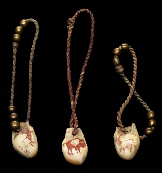 Curator: We're looking at three Elk's Tooth Pendants, created by Pikuni artists from the Blackfeet nation between 1850 and 1900. They are relief carvings made of ivory, on a miniature scale. Editor: Immediately, the worn texture of the ivory stands out—almost like aged parchment, hinting at countless stories held within each pendant. There's a simple rawness to it. Curator: Indeed. Notice how the narrative is constrained within the form, dictated by the tusk’s curvature. The drawings themselves are economical—lines delineating the elk or deer. Editor: Absolutely. Consider how the artist sourced, carved, and pigmented the ivory—each step reliant on the materials available within their environment, revealing an intimate knowledge of their world. It makes you think about the hands that meticulously created these tiny worlds, perhaps during long winters, imbuing each piece with skill and purpose. Curator: And what of the subjects themselves? The depicted deer and elk motifs speak to a deeper visual vocabulary—likely symbolic. A study of Pikuni cultural norms is essential for interpreting such visual markers. Are they clan symbols, hunting aids, or indicators of the wearer's achievements? The formal simplicity of each composition demands thorough unpacking. Editor: Thinking materially, each element from the ivory itself to the simple pigment seems inherently tied to place, labor, and ritual use. They are miniature documentaries of the relationship between these peoples and their environment. These small carvings testify to Pikuni life—what could be preserved and adorned through generations of craftsmanship? Curator: Quite insightful. Considering its inherent structural components and the context of artistic Indigenous Americas practice is crucial to our understanding and, as well, to the formalistic interpretations and art appreciation for future researchers. Editor: By examining these Elk's Tooth Pendants, we find so much more than artistic carvings: intimate ties to tradition and material legacy.