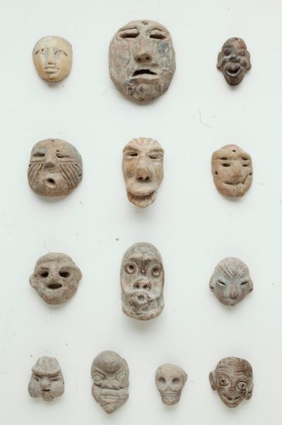 Curator: Today we’re looking at a “Miniature Mask” from the Huastec people, dating roughly from 250 to 750. It’s made of earthenware. Editor: I am really drawn to the raw, earthy quality of the masks, and particularly how the artisans utilized the material. What elements of its visual composition stand out to you? Curator: Observe the surface treatment, the way the texture varies across each mask, particularly in the first mask and how it changes the distribution of value. Also, the repetitive use of simple geometric shapes like circles and slits is interesting in how they depict complex facial features. These elements point to an artist highly attuned to form. The negative space created by the carved features contributes significantly to their overall impact. Notice how the absence of material defines the nose and mouth. Editor: I hadn't considered the use of negative space. How do you think the variation in each mask tells its story? Curator: These choices emphasize certain formal qualities. The top mask, seems cruder. It's use of simple circles gives it an organic and rustic quality. The bottom mask, more refined in its lines, strikes a balance between stylization and realism, demonstrating that careful consideration was placed on line quality. Note the smoothness and balance of facial traits compared to the mask directly above it. Each is a cohesive statement on form, even if that statement varies slightly in expression. What do you think of the mask as an expressive object rather than something communicative of ritual or a social identity? Editor: Looking at it now, I notice the contrast. So much intention was given to visual features. Thank you. Curator: Of course, these miniatures have provided a new way to engage with ancient form.