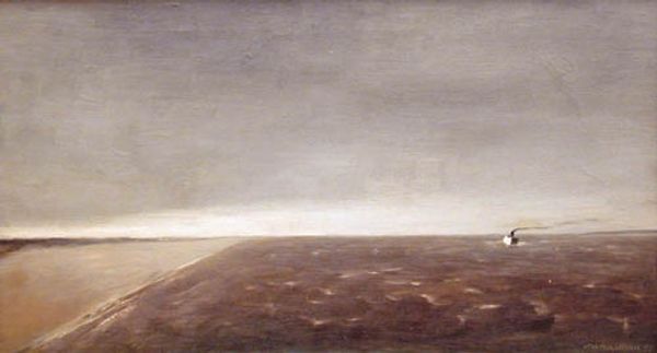 Editor: We’re looking at Caspar David Friedrich’s "Boat on the Shore. Moonrise," created around 1839. It's a drawing done with graphite and other materials on paper, now held at the Hermitage. The scene has a stillness to it; a quiet melancholy. What do you see when you look at this, what story does it tell you? Curator: Oh, it's funny you say stillness because that's exactly what sings to me. To me it's as though all time has slowed down. It’s more of a feeling really than a story - a feeling of vastness. Do you notice how Friedrich plays with light and shadow here? The moon, though barely visible, casts this subtle, almost dreamlike glow upon everything. It whispers of eternity, doesn't it? Editor: Definitely a whisper. And I love that: eternity! Is the boat part of that, you think? It seems so...stuck. Curator: Absolutely! That boat, stranded between the land and the sea, is all of us, isn’t it? Longing, yearning, never quite at rest. Always caught in a sort of… romantic middle ground. That muted palette, though, keeps pulling me back; like faded photographs. The scene becomes less about any one moment, but more about remembering it, right? Editor: I see that. So even if he didn't INTEND for this to feel still, by using those materials he's practically guaranteeing it, right? Curator: Precisely! Technique becomes integral to the whole sensation. Honestly, it reminds me of remembering childhood summers at the shore – not a bright postcard, but sepia toned, infused with something bittersweet. That to me, is the magic of Friedrich. Editor: Thinking of it that way, I feel like I almost know this place, even if I never visited it! Curator: Exactly! It's an externalisation of our own emotional landscape. Art making a tangible imprint. That, to me, is the most beautiful part.