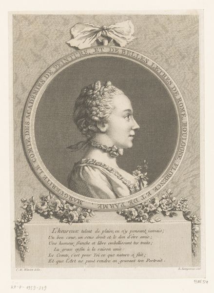 Curator: Here we have an engraving of "Prinsesse Charlotte Amalie," made sometime between 1747 and 1799 after Andreas Heckel. The print is part of the collection at the Statens Museum for Kunst. What's your initial impression? Editor: Well, the meticulous hatching definitely grabs my attention. It is like a web that holds and grounds her. The starkness is interesting—nothing obscures the representation of status and social fabric here. Curator: The surrounding emblems are heavy with meaning. Above the oval portrait we see a crown representing royalty, a cross atop an open book perhaps symbolizing faith and learning, and wheat suggesting prosperity and God's abundance. All classic visual tropes of power. Editor: Yes, it’s so conventional, isn't it? The sheer labor involved in producing the fine lines through the printmaking process is impressive though, underscoring that very act of representing and memorializing nobility and its attendant visual demands. Curator: Absolutely. Engraving as a technique allowed for a high degree of control, reflecting the controlled image of Charlotte Amalie herself and what her role stood for. How might her own presentation through attire further communicate aspects of her cultural importance? Editor: Her elaborate ruff and bejeweled gown certainly telegraph status and wealth. But I wonder about the message sent to other women who would look to such an image and attempt to mirror its aesthetics. Where does one source such material in that time period, and who is responsible for its design and construction? Curator: These images cemented visual languages for power. The iconography is immediately legible within its cultural context, reminding viewers of the order and divine right that defined the age. Even in print, this engraving carried significant cultural weight. Editor: But also reflects the economic structures underpinning its very creation. It’s a fascinating window into not just visual codes, but material circumstances and a stratified system of making. Curator: Indeed. Looking closer allows us to trace those layers of meaning. Editor: Absolutely. Thanks for pointing that out.