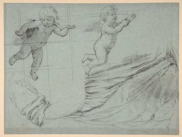 This vignette of three children was created by Lorenz Frølich, sometime in the 19th century, using pen and ink on paper. It’s a modest drawing, but consider the hand-eye coordination required to create such precise linework with a quill. The artist has deftly captured the children in motion and affection. Frølich used hatching and cross-hatching to create depth and shadow, giving the figures a sculptural quality. This technique requires a steady hand and an understanding of light and form. The controlled application of ink creates textures and tonal variations, from the smooth skin of the children to the rougher fabric of their capes. The artist's skill is evident in the details, like the delicate features of the children's faces and the subtle folds in their clothing. This emphasis on process and the skilled use of simple materials elevates the drawing beyond a mere sketch, revealing the artistry inherent in traditional techniques. It reminds us that even the simplest materials, when handled with care and skill, can produce beautiful and expressive works of art.