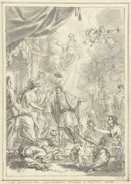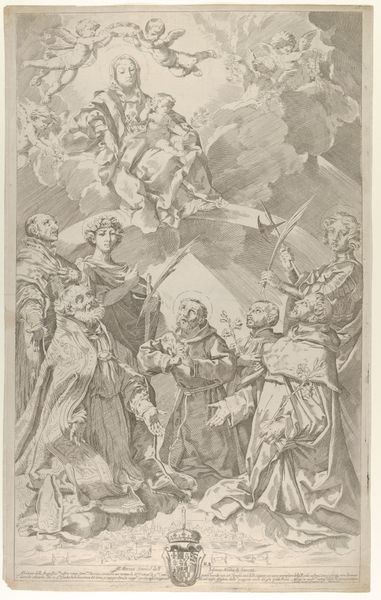 Editor: This print, "Allegorical Representation with Naked Truth and Scholars," dating back to 1720, caught my eye at the Rijksmuseum. It's unsigned, simply listed as by an Anonymous artist, an engraving that is a complex tableau. The intense detail, the dramatic figures... It has such a theatrical feel! What stands out to you? Curator: Theatricality is key, definitely, but let's consider its broader role. Prints like this one circulated widely, becoming potent tools for disseminating ideas, particularly during periods of intense religious and intellectual debate. Who gets to define 'Truth' and how it is portrayed becomes very important. Note how ‘Truth’ is literally elevated, but above learned figures arguing, even battling each other below. Editor: It's interesting you bring that up; I initially interpreted those figures as adoring. Are you saying there's conflict embedded in this image? Curator: Absolutely! The tumbling figures at the base, along with those who seem to debate amongst themselves, are signs of discord and even disbelief. Consider the socio-political context of the early 18th century – what theological arguments or emerging scientific discoveries might be causing such 'scholarly' chaos? Editor: So it’s not just about celebrating truth, but also about commenting on the intellectual struggles of the time. I hadn’t considered that it was so pointed. Curator: Precisely! Prints like this functioned within specific power structures. Commissioned, circulated, collected - each step reveals who controlled the narrative. Consider the role that religious institutions and new secular academies might have played in fostering debates like the ones suggested here. Who created the demand? Who bought it? Why? Editor: That’s a helpful framework for considering its impact. I was mostly considering aesthetic concerns, the play of light, the figure’s dynamism. It's great to consider what the print *did* and how it made a point, in real time! Curator: Exactly! Visual art always operates within a network of power.