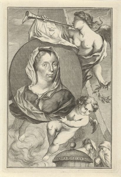 Jacob Houbraken made this engraving, "Portrait of Johanna Koerten," sometime between 1698 and 1780. The image commemorates Koerten, a Dutch artist known for her exceptional silhouette cuttings, a popular art form at the time. The print layers Koerten's portrait with symbolic imagery; angels, heraldic symbols, and ornate borders elevated her status. This reflects the Dutch Republic's emerging culture of celebrating individual achievement. The engraving demonstrates how the institutions of art, like academies and printmaking workshops, played a role in shaping artistic reputations. The Rijksmuseum's acquisition of this print also speaks to the public role of art in preserving cultural memory and defining historical narratives. By examining archival materials, exhibition records, and contemporary writings, we can gain a deeper understanding of the social conditions that shaped both the production and reception of this image. In the end, this portrait becomes a window into the complex interplay of gender, artistic skill, and cultural values in 18th-century Netherlands.