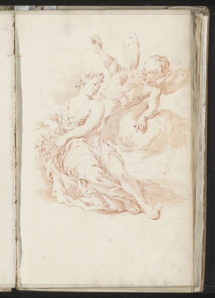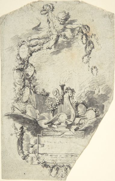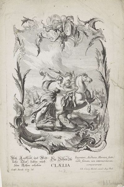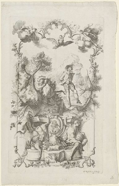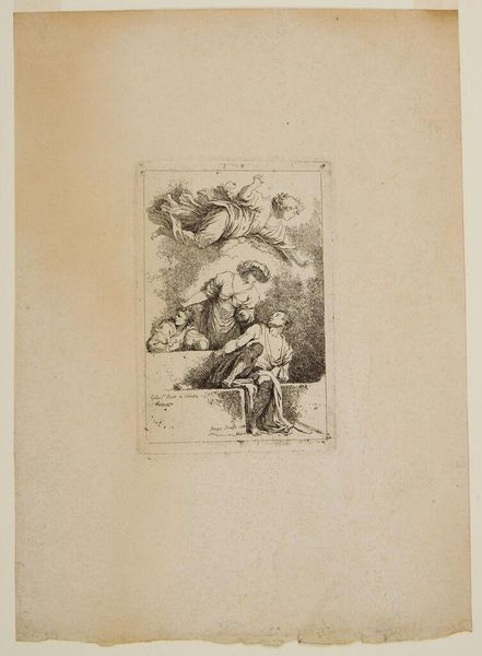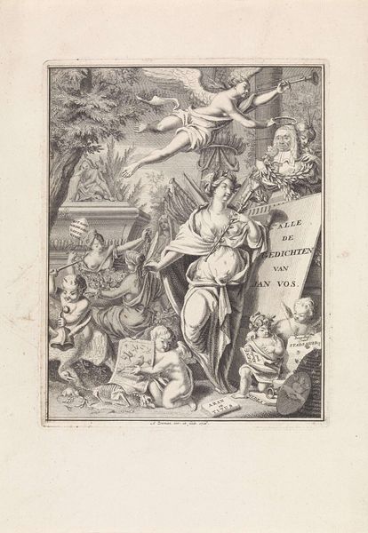 Editor: This is Bernard Picart’s "Immaculate Conception." It's an etching. The angel wings and flowing robes give it a real sense of movement. What structural elements stand out to you? Curator: Observe how Picart articulates the central figure within a vortex of cherubic forms. Note the strategic placement of light and shadow, creating depth and directing the viewer's gaze towards the Virgin's beatific expression. Editor: So the formal composition elevates the subject matter? Curator: Precisely. The etching’s technical virtuosity enhances the symbolic weight. Editor: I see it now. Thanks for pointing out the formal elements. Curator: My pleasure. It is in such structural harmony that the spiritual narrative finds its visual voice.