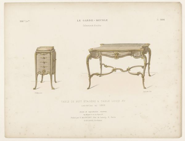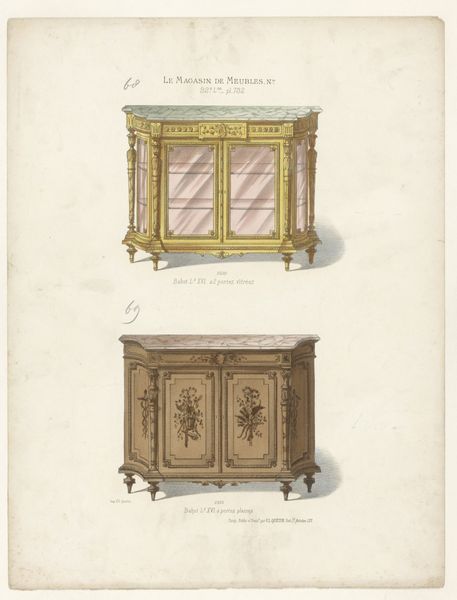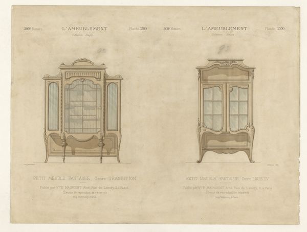 This print, "Buffetkast en consoletafel" presents an architectural study of furniture design, using delicate lines and subtle color washes. The composition is divided into two distinct forms: a cabinet and a console table, each rendered with precision. Notice how the anonymous artist uses symmetry and proportion to convey a sense of classical order. The lines are clean, defining the edges and structures with clarity, while the pastel hues soften the otherwise rigid forms. This is particularly noticeable in the legs of the console table, where the detailed ornamentation is meticulously depicted. The artist employs hatching and shading to suggest depth and materiality, indicating the reflective surfaces of glass and marble. The print functions as a diagram, a systematic representation of design elements meant for replication or study. It embodies a structuralist approach, reducing complex objects into essential components, making it a fascinating example of how functional design intersects with artistic representation. The use of formal elements makes this piece a visual language that speaks to functionality and aesthetics.