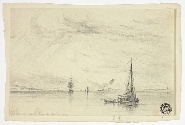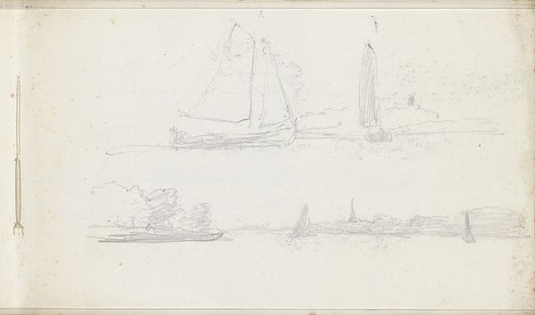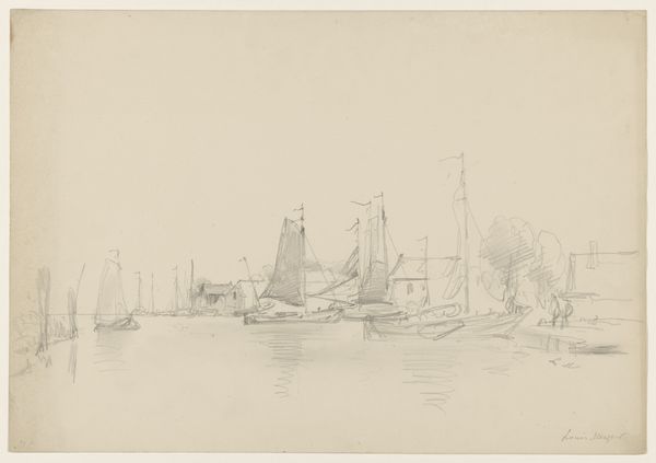 Curator: This drawing, “Zeilend schip met op de achtergrond schepen voor anker” or "Sailing Ship with Ships Anchored in the Background," by Willem Bastiaan Tholen, made sometime between 1870 and 1931, captures a maritime scene in pencil on paper. It resides here at the Rijksmuseum. Editor: My immediate impression is one of serenity tinged with melancholy. The delicate lines create a soft, almost dreamlike quality. There's a stillness in the water and the sky that's quite captivating, and all executed with very clear understanding of tone and composition. Curator: Indeed. Notice the artist's confident handling of the pencil. The subtle gradations in tone suggest depth and atmosphere far beyond the capabilities of line alone, which, I suppose, also refers to his masterful understanding of impressionsim, while capturing elements of realism. He also deployed different hardnesses and techniques in application. Editor: Yes, the medium itself speaks volumes about the process. The swift, gestural strokes hint at a rapid execution, as though Tholen were capturing a fleeting moment. We see a scene from everyday life, created not on a canvas but on paper using a simple material such as pencil to achieve a detailed sense of atmosphere and tone. Curator: Precisely. One also recognizes that he may be referencing older artistic traditions using graphite and pencil, such as drawing practice, sketches for larger paintings and printmaking. Look at the texture in the sky, achieved through layered strokes, versus the smooth rendering of the water. The artist's craft lies not just in depiction but also in the expressive quality of his marks. Editor: It truly makes one think about the labour, in a way. The artist and artisan had a clear set of concerns during the second industrial revolution that have shifted quite a bit in the present moment. There are the vessels themselves, constructed from who knows where, arriving who knows where…It’s beautiful that such a detailed account of their presence exists! Curator: Considering the historical period, this artwork becomes quite intriguing. Tholen lived during a time of immense social and technological change. And you bring a very important perspective to this observation; how those objects arrived to that port is key! Editor: Looking at this piece has really reframed my thinking about how readily available even basic artistic supplies were during this period for creative practice. Curator: And from my end, it reinforces how a skilled hand and discerning eye are foundational in translating complex perceptions onto paper.