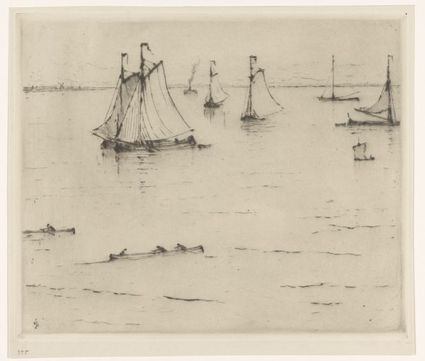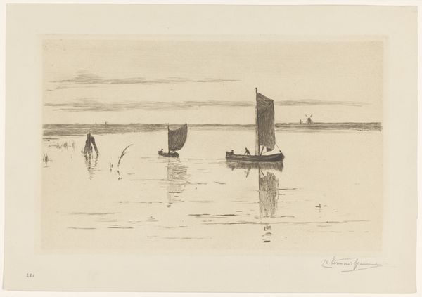 Curator: This is a fascinating etching by Carel Nicolaas Storm van 's-Gravesande, titled "River View with a Sailboat." The work likely dates from the latter half of the 19th century. What are your initial thoughts? Editor: Stark. A sort of melancholic stillness. It's so minimalist—just the essential lines to suggest water, land, and sky. Almost a premonition of environmental fragility, perhaps, that feeling of the tide receding... Curator: I agree about the stillness. Van 's-Gravesande was known for capturing very specific atmospheres. Water, of course, is a recurring element across time and culture, carrying myriad symbolic meanings of purification, change, the unconscious. What meanings do you think water carried for the artist, and perhaps his audience? Editor: Well, in the 19th century, industrialization was transforming the Netherlands. Waterways were vital for transport and trade, but also becoming increasingly polluted. That lone sailboat might represent a longing for a simpler, more natural existence, a critique of rampant progress, perhaps. I also think about labor and how bodies may have interacted with those landscapes. Curator: I like that interpretation. It highlights the contrast between nature and the developing industrial world. In terms of symbolism, a single boat can often signify a journey, transition, or even solitude. Do you see any particular symbols that strike you as psychologically potent? Editor: I see that the church tower in the distance offers some connection to community and social structures, while the lone sailboat gestures towards themes of isolation, autonomy, or the risks taken by solitary laborers traversing a landscape in flux. And the extensive waterline emphasizes themes of access and dispossession. Curator: Intriguing observations! It all adds layers of complexity to what appears at first glance to be a simple, unassuming scene. Editor: Exactly. It’s a subtle piece, yet when we really delve into its context, technique, and underlying themes, it offers a powerful commentary. Curator: Agreed, seeing it as a document of both social tension and a symbol of human connection.