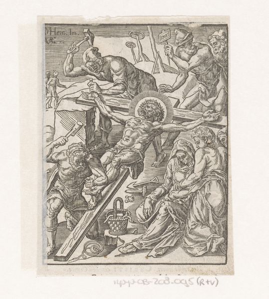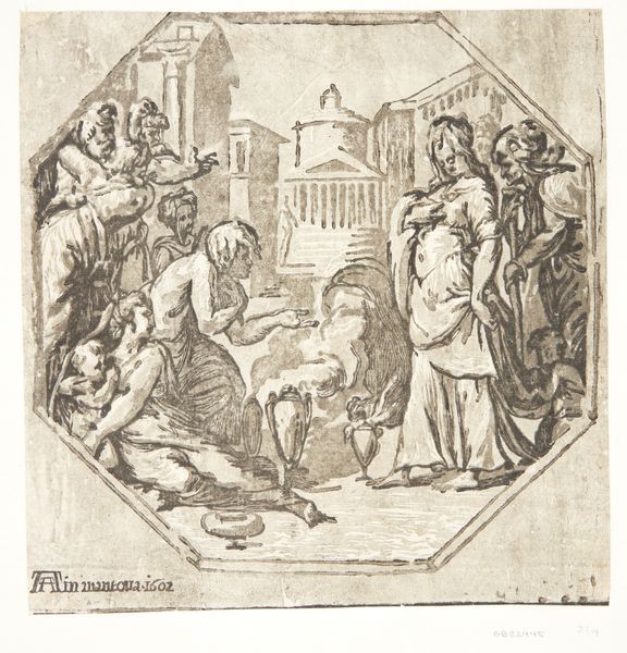 Antonio da Trento created this print, "Odysseus on the Island of Circe," likely in the 16th century, using a circular format to frame a pivotal scene from Homer’s Odyssey. The composition is immediately striking for its contrasts: the fluid drapery and serpentine forms set against architectural elements. The scene captures Circe offering a potion to Odysseus's men, who are being transformed into beasts. Notice how da Trento uses line to define shape and texture, particularly in the rendering of Circe’s flowing robes and the grotesque figures of the transformed men. The contrast between the human figures and the animalistic forms introduces a play of identity and metamorphosis, destabilizing clear distinctions. The print's dense composition invites us to consider how visual forms can embody complex narratives and philosophical ideas about transformation, perception, and the precarious nature of identity. Ultimately, this print prompts us to reflect on how art can engage with classical texts to explore the human condition.