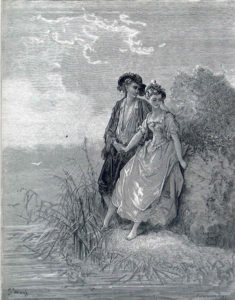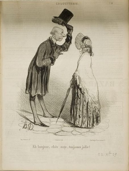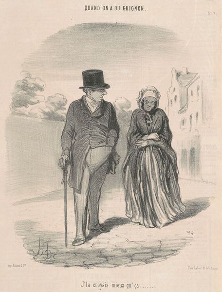 Curator: This is Honoré Daumier's lithograph, "A Castle in Spain." Editor: The starkness of the lithography creates a rather bleak, almost satirical mood, don't you think? Curator: Indeed. Daumier masterfully uses line and shading to emphasize the almost pathetic stance of the bourgeois couple. Note how the etching directs our gaze. Editor: It's a commentary on class, surely. The woman, prodding at what seems to be a sandcastle with her walking stick, appears disillusioned. Their aspirations are so… fragile. Curator: Perhaps. The very composition emphasizes the futility of material dreams, and the socio-economic disparity inherent in aspiring to something unattainable. Editor: The image speaks volumes about the human condition—ambition, disillusionment, and the quiet despair of unfulfilled dreams within the context of 19th-century France. Curator: It underscores how Daumier, using minimal means, achieves maximum expressive effect. Editor: A poignant visual narrative that transcends its medium.