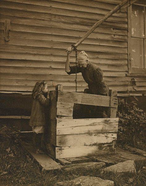 Editor: So, this is Harry G. Phister's gelatin-silver print, "The Old Well," from 1908, currently housed at the Minneapolis Institute of Art. It’s just so... brown. And quiet. Almost melancholic. What do you see in it? Curator: Brown like a faded memory, perhaps? For me, this piece whispers of simpler times, hard work, and the interconnectedness of life and land. Notice how the well’s structure seems almost an extension of the house, and how the trees mirror the vertical lines of both. The figure, obscured but present, feels integral to this whole ecosystem. Makes you wonder about the story of this place, doesn't it? Editor: Absolutely. The figure almost blends into the wood of the house. Were photographs like this meant to be art, or simply documents back then? Curator: Ah, a delicious question! Pictorialism, the style this piece flirts with, certainly elevated photography. Artists manipulated the images, aiming for emotional impact and aesthetic beauty, mimicking painting. Think of it as photography's awkward but charming phase of trying to be taken seriously. Do you think it succeeds? Editor: I think it's doing something different than painting. The blurriness and soft focus give it a dreamy, timeless feel that a sharper photo wouldn't have. It feels more intimate somehow. Curator: Intimacy is a great word for it! It captures a feeling, not just a scene. It makes me nostalgic for a past I never even knew, and isn’t that something? What do you take away from it? Editor: It makes me want to slow down, look closer, and appreciate the beauty in the ordinary. And maybe learn to work a well. Curator: (chuckles) A fine ambition, indeed. Perhaps we can find a museum exhibit on well-digging next! It is a lovely glimpse into what a photograph can evoke, like turning the page on a faded time, something like life's echo in stillness.
