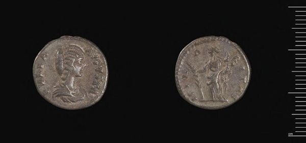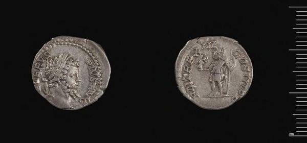 Curator: What strikes me immediately about this Denarius of Septimius Severus is its palpable aura of authority, even in its modest scale. Editor: Indeed. This silver coin, residing at the Harvard Art Museums, serves as more than just currency; it's a powerful emblem of Severus's reign, a piece of propaganda disseminated throughout the Roman Empire. Curator: Absolutely. The portrait isn't merely a likeness. The carefully rendered features project strength, wisdom, and imperial legitimacy, fitting neatly into a complex iconography of power. The weight of a dynasty rests upon such symbols. Editor: And the reverse reinforces this narrative, likely depicting a deity or allegorical figure associated with Roman virtues, legitimizing Severus's rule through divine association and cultural values. Curator: The visual language speaks volumes, continuing even today. I always find myself pondering the psychological impact of these repetitive, yet evocative, symbols on both the Roman populace and on us viewing them now. Editor: It’s a potent reminder that art, even in its most functional forms, shapes our understanding of history and the powerful figures who try to control it. Curator: Yes, and the long echoes of symbols like these really shape human consciousness. Editor: A lasting testament to the power of imagery, even on a coin.
