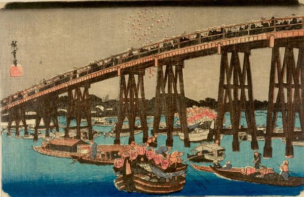 Editor: This is Utagawa Hiroshige's "Eitai Bridge and Tsukudajima" from his series Famous Places in Edo. I find the depiction of the people crossing the bridge quite striking. What stands out to you in this piece? Curator: Notice how the bridge acts as a symbolic connector, linking the earthly realm of daily life, represented by the bustling figures, with the spiritual promise of Tsukudajima in the background. Do you see a visual harmony between these elements? Editor: I do see that now! The bridge really does act as a unifier. Curator: Consider also how the boats with their sails create rhythm and depth; they are not mere decorations but symbols of passage, trade, and the cyclical nature of life itself. The boats appear repeatedly in Japanese art. Editor: That's fascinating. I'll definitely look at similar works with a new appreciation for these visual metaphors.