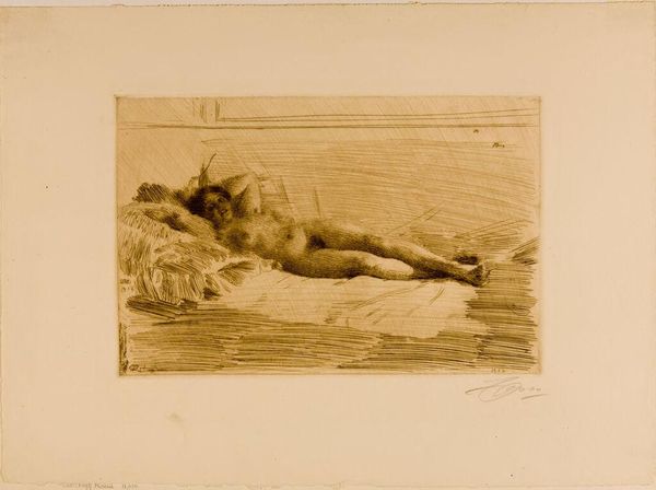 Editor: Here we have Anders Zorn's "On the Sands," an etching. The figure is really striking, but I'm more drawn to the landscape and the visible marks of the etching process. What can you tell me about how the materials might shape our understanding? Curator: Well, the etching itself, a reproducible medium, democratizes the image. Consider how Zorn, through labor-intensive process, depicts leisure. The lines, almost like furrows in a field, ground the nude figure. Is this idyllic or does it evoke a kind of ownership or taming of the body and the land? Editor: That’s interesting. I hadn't considered the implications of a reproducible nude in this context. Thanks! Curator: Indeed, considering the social and material conditions of production is crucial.