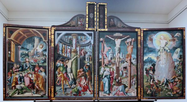 Curator: Let's take a moment to discuss this impressive altarpiece attributed to Jerg Ratgeb, dating back to 1510. It's a tempera on panel triptych known as the Barbara-Altar from Schwaigern. Editor: It’s striking, isn't it? The gold leaf backgrounds catch the light, almost giving it an otherworldly feel. But the central panel—it depicts a brutal scene. I am drawn to that kneeling figure, she emanates strength amid the impending violence. Curator: Indeed. The triptych format was very popular during this period in Early Renaissance art, offering multiple panels to tell a story. It would likely have served as a visual aid and point of focus in a church. We must remember the potency of visual culture within largely illiterate populations. Editor: Absolutely. And the story here, of Saint Barbara, resonates on multiple levels. Look at how Ratgeb positions her as both a figure of religious devotion in the side panels—note the vision of Christ on the left, for example—and of resistance against patriarchal authority in the centre panel's martyrdom scene. The piece makes her active and agentive within the confines of patriarchal control. Curator: The history painting here captures much of the socio-political unrest characterizing the turn into the 16th century. Ratgeb himself, it's worth remembering, was no stranger to upheaval; he later became involved in the German Peasants' War and was executed for it. Editor: And it shows in his art! His history becomes irrevocably linked to his representation. The composition of the central panel – the contrast between Saint Barbara's stillness, humility, and defiance and the soldier's active violence against the chaotic background landscapes — speaks to a world in turmoil. Are the people observers? Collaborators? Victims? Curator: Good questions. Consider also the institutional forces that would have shaped a piece like this. Commissioned for a church in a town that would have experienced plague and famine; no doubt this artwork offered an instructive moral lens. Editor: It is through an understanding of these intersecting histories—the artistic, the social, and the biographical—that we begin to grasp the complexity and continuing relevance of this compelling altarpiece. Curator: I find the piece more striking considering its unique place within an oeuvre largely created outside a city's art environment, created under distinct local traditions. Editor: Indeed; the altarpiece invites not just reverence, but reflection on faith, power, and defiance that persist today.