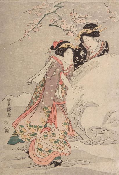 Curator: Immediately, I'm struck by the almost melancholic stillness of these figures. It’s as if time has slowed, and the world around them holds its breath. Editor: This is Utagawa Toyohiro's "Three Figures," now residing here at the Harvard Art Museums. Toyohiro, who lived from 1763 to 1828, was a prominent artist of ukiyo-e, this particular artwork gives us a glimpse into the lives, or maybe idealized versions, of women in his time. Curator: The way their robes flow, almost merging with the muted landscape, it's like they are one with the environment around them. Perhaps it's about showing women’s harmony with nature? Editor: Yes, there is an element of that. But also, there is the very real social pressure on women to conform, to be pleasing, to know their place in society. Curator: Well, harmony can be pressure too. But their serene expressions and the flowing lines create a sense of peace, don't you think? Editor: It’s a constructed peace. One that is built on societal expectations. The beauty is undeniable, but I see the weight of it all too. Curator: That's what's so fascinating, isn't it? This image holds both beauty and a hint of the unspoken, a silent story. Editor: Precisely. And that tension is what makes it a compelling piece of art and a valuable cultural artifact.