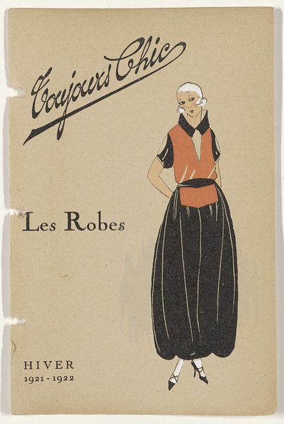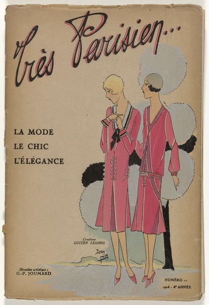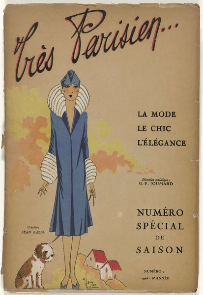Editor: Here we have an intriguing mixed-media work titled "Très Parisien, 1928, No. 5, 9e année," created in 1928 by an anonymous artist. It’s currently housed in the Rijksmuseum. What strikes me is the emphasis on line and shape—a very flat picture plane—and also its muted color scheme. What do you see in this piece? Curator: The composition hinges on the interplay between linear precision and the suggestion of depth through overlapping planes. The color choices – the ochre background against the pale lavender and powder blue details - evoke the sophistication inherent to Art Deco principles. Look closely: observe the verticality of the dress set against the diagonal slash. How does this tension inform our reading of the work? Editor: I see that tension. It’s like a struggle between flatness and depth. But also, I am intrigued that so much importance is assigned to geometric abstraction while still using figurative forms. Is there a kind of conversation there? Curator: Precisely. Notice the stylistic reduction of the figure and garment into basic geometric forms; the cylinder of her cloche, and the cascading angular patterns in her skirt. Do you agree that these choices redirect attention from pure representation to design principles? Editor: Yes, it pushes it towards a set of relationships based on line, shape, and tone and away from… an attempt to accurately depict this person or this garment. I’m starting to see that this approach speaks volumes about its time and perhaps shifts the intent away from simple aesthetics. Curator: An excellent observation! It invites us to reflect upon not just WHAT we are seeing, but HOW the visual language directs our gaze and structures our comprehension. Editor: Thanks, I will certainly look at more Art Deco work. I see form plays just as important a part in meaning as other factors do!