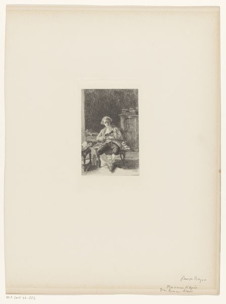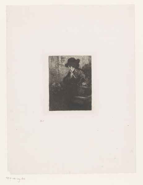 Félicien Rops created this small-scale etching, "Woman with a Scottish Hat." The dense network of fine lines creates a composition of tonal contrasts, drawing our eye to the figure's languid pose and the textures of her dress and the surrounding interior. Rops masterfully uses the etching technique to suggest a world of complex social dynamics. The Scottish hat, slightly askew, acts as a signifier, hinting at the sitter's identity and perhaps alluding to the exotic or the unconventional. The artist’s close attention to the textures and patterns—from the wallpaper to the woman’s clothing—creates a semiotic field, where each element functions as a sign, contributing to a narrative that Rops leaves open-ended. Consider the careful arrangement of lines that define form and space; it is here, in the formal elements, that we find Rops’s commentary on the fluidity of identity and the constructed nature of social roles. This work is a testament to the power of suggestion, inviting us to ponder the stories woven into the visual fabric of 19th-century life.