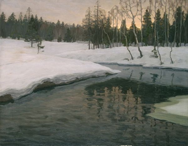 Editor: We're looking at "The Frozen Pool, March," an oil on canvas painted by Willard Metcalf in 1909. It gives off a certain stillness; the muted colors are so evocative. What stands out to you, in particular? Curator: Well, let's consider Metcalf's methods. Oil paint, obviously industrially produced even in 1909, allowed for the slow, deliberate layering we see here. The 'alla prima' or wet-on-wet technique evident, which speaks to both efficiency and a deliberate embrace of visible brushstrokes. This suggests an engagement with the marketplace as well as aesthetic choices: How does this approach balance the desire for artistic expression with the economic realities of production? Editor: That's an interesting perspective. I was focusing more on the light and how it interacts with the snow, but I see your point about the production and material conditions affecting the art. Curator: Exactly. The material isn’t just *there*; it dictates, to some extent, what can *be* there. Metcalf chose readily available pigments. The surface is subtly textured. And how would his social standing play into choices of materials, his leisure time for 'en plein air' painting, and ultimately the distribution and reception of his work? Editor: So, beyond just seeing a pretty winter scene, we can read into the entire production process, from paint to marketing. Did Metcalf's impressionistic style affect his economic prospects? Curator: Undoubtedly. Impressionism was becoming marketable, yet still maintained a veneer of artistic "integrity." By aligning himself with this style, Metcalf was likely appealing to a specific consumer base – a rising middle class eager to acquire symbols of culture and refinement. He both fulfills and perpetuates material and social systems. Editor: I've certainly never considered Impressionism from this angle before. Thank you for shining a light on those often-overlooked connections! Curator: Likewise, you’ve pushed me to think about the immediate impact of light on the scene; that element of the art remains primary!